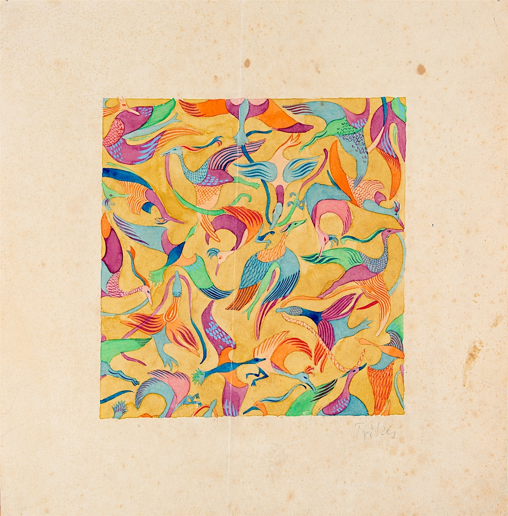 Um 1937 entstandener Textilentwurf. Nach Abschluss seiner Ausbildung bei Itten in Krefeld ging Trökes mit einem Empfehlungsschreiben von Johannes Itten nach Augsburg zur Firma Bemberg als Musterzeichner. So konnte er sich in der Zeit des Nationalsozialismus als Maler finanzieren.
